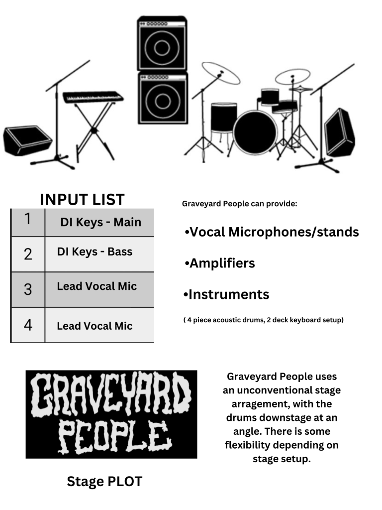 Forming in early 2022, Graveyard People has since played over 125 shows in 13 states. They have opened for national/touring acts such as The Effigies, Daikaiju, Year of the Dragon, Action Friend, Nox Novacula, Igor and the Red Elvises, Doom Scroll, Flesh Produce, Peculiar Pretzelmen, Trip Lip, Never Kenezzard and Blood Daubers.